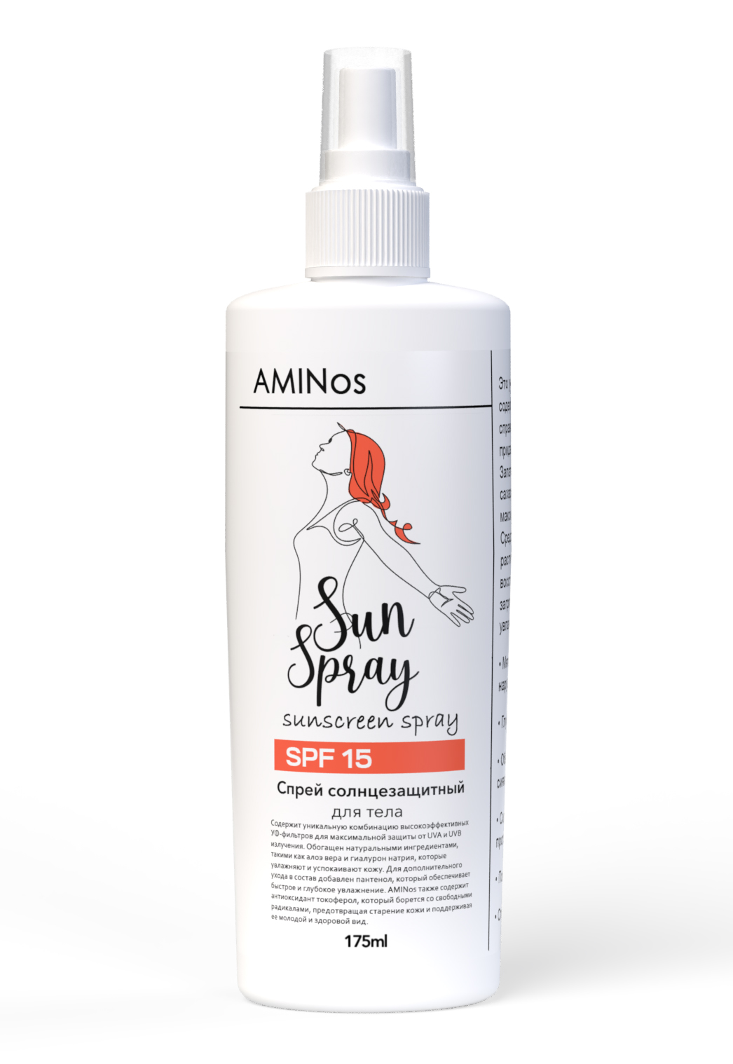 AMINos SPF 15 Солнцезащитный спрей для тела подходит для ежедневного использования перед выходом на улицу в солнечные дни. Перед применением необходимо тщательно встряхнуть флакон. Нанесите спрей на открытые участки кожи, равномерно распределяя его. Дайте средству впитаться перед тем, как одеться. 175 мл спрея идеально подходят для использования на протяжении всего летнего сезона для защиты кожи от УФ-лучей. Регулярное использование AMINos sunscreen spray поможет сохранить кожу увлажненной, мягкой и здоровой.